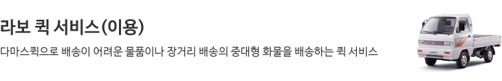 | 접수시 체크사항 | 출발지/도착지의 행정동이름, 화물의 무게(20Kg이상시), 가로/세로/높이의 각 길이(cm) |